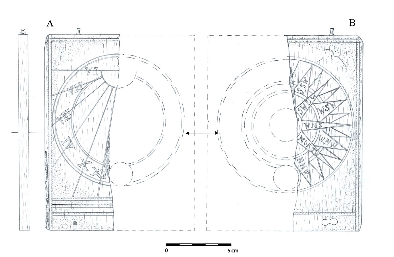 L’objet porte sur une de ses faces des incisions en lignes horaires (A) et, sur l’autre, une rose des vents directionnelle (B). Les graduations sur les surfaces de la tablette sont peu lisibles ; ce sont des chiffres et des lettres romains et ils ne semblent pas gravés, mais poinçonnés au moyen de matrices. Sur la face où se trouvent les lignes horaires, sont perceptibles deux petits trous par lesquels le gnomon (ou style) était fixé. Des trous situés au bas de l’objet, utilisés pour la charnière, suggèrent qu’une partie de ce cadran est manquante, ce qui le classe dans la catégorie des cadrans diptyques de poche. La tablette manquante était probablement équipée en son centre d’une boussole. Sur le haut du cadran est fixé un petit anneau en alliage cuivreux faisant partie d’un fermoir aujourd’hui disparu, qui permettait de bloquer les deux tablettes l’une contre l’autre lors du transport. En position d’utilisation, les deux tablettes en équerre tendaient le style (fil de laiton ou de bronze), qui projetait l’ombre sur les faisceaux horaires et donnait l’heure solaire du lieu. En tenant compte des dimensions du cadran et de la finesse des graduations, on peut dire que le graveur a prodigué du mieux possible tout son savoir-faire.